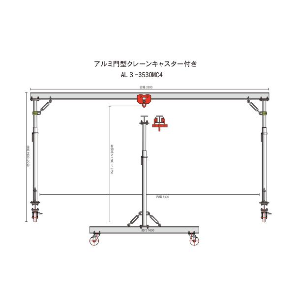 アルミ門型クレーン軽量組立式 キャスター付200KG W3500 日本製(法人様のみ配送可)