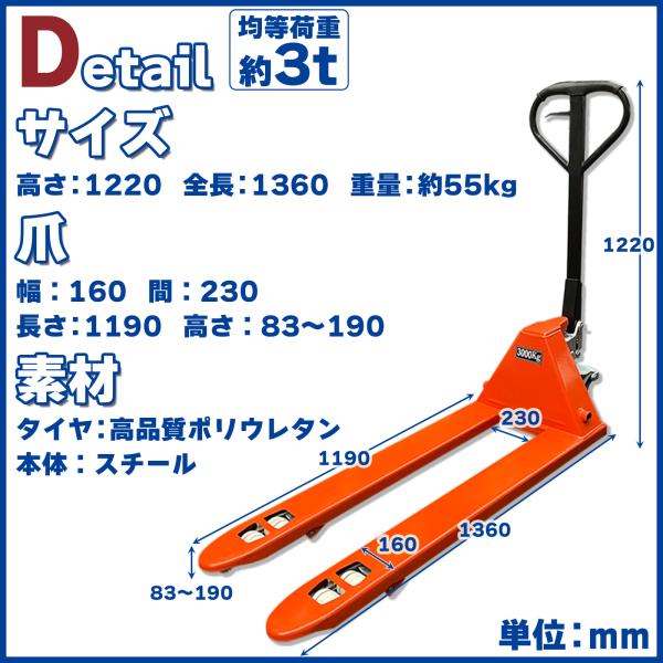 ハンドリフト 3t 低床 パレット用 長爪 ロング フォーク長さ 1190mm 幅560mm 油圧式 ダブルローラー 台車