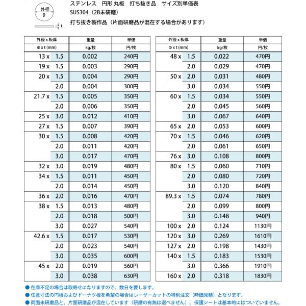 ステンレス(SUS304) 2B未研磨 円板 平丸板 打抜き材