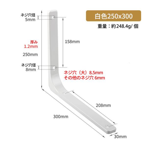 棚受け金具300mm×250mm×30mm ホワイト 2本セット アイアンブランケット【付属品】ボードアンカー4個、ネジ大小8個 取り付け説明書