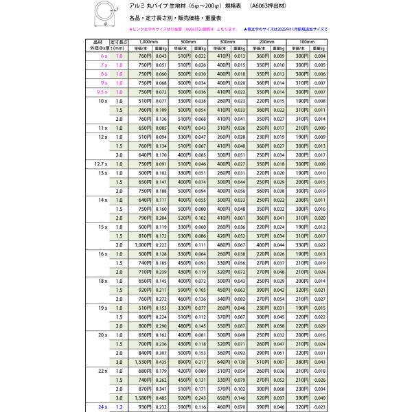 ◆アルミ 丸パイプ(A6063)生地材 各品形状の(1000mm)各定寸長での販売(1カット無料サービス)