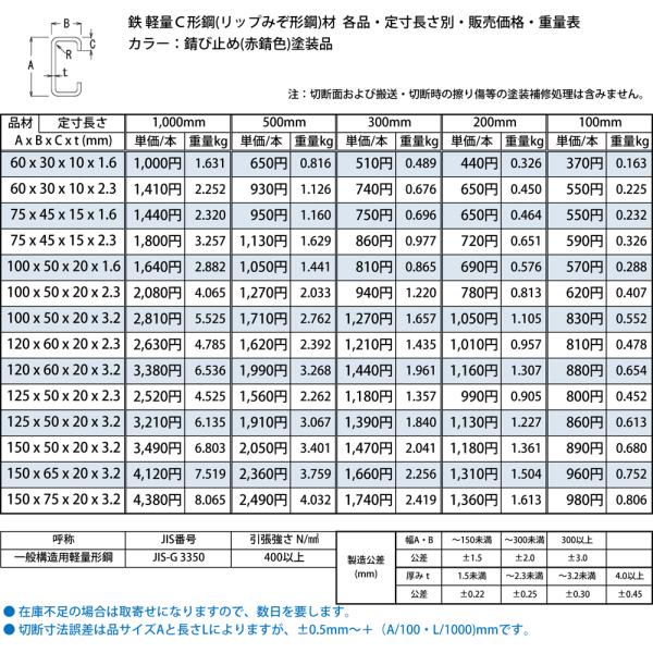 ◆鉄 カラー軽量C形鋼(リップ付) 各品形状の(1000〜100mm)各定寸長での販売(1カット無料サービス)