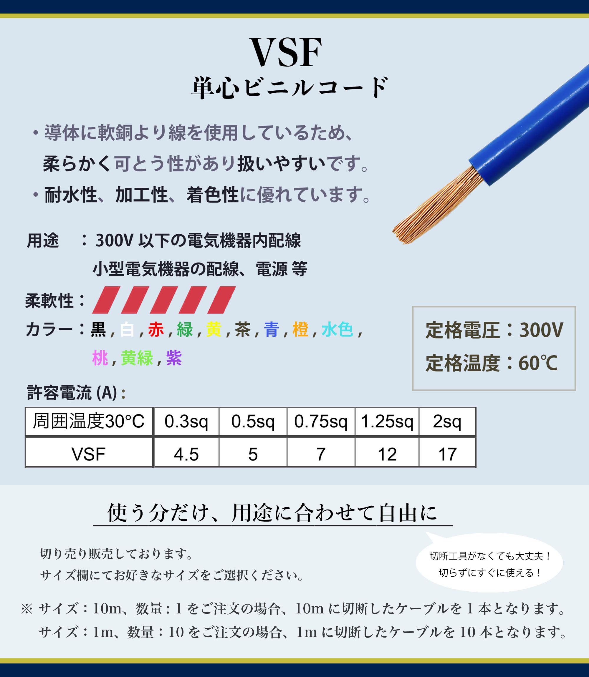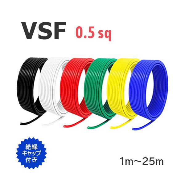 切り売り(1m〜25m) VSF 電線 0.5sq 絶縁キャップ付き 黒,白,赤,緑,黄,青 300V 国内メーカー品 単心ビニルコード ケーブル
