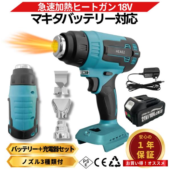 マキタ 互換 ヒートガン 18V バッテリー充電器セット コードレス 温度調整 カーラッピング 熱収縮チューブ 塗料剥がし(HEA02-AB1830B-1-HC1610)