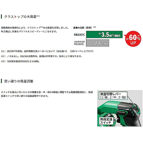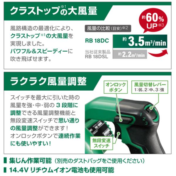 HiKOKI ハイコーキ 18V コードレスブロワ RB18DC (BCL) リチウムイオン電池 BSL1820M 急速充電器 UC18YSL3 付