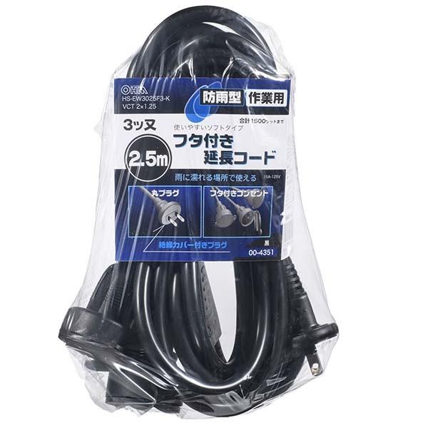 延長コード 防雨型 フタ付 3又 2.5m 黒 ブラック_HS-EW3025F3-K 00-4351 OHM オーム電機