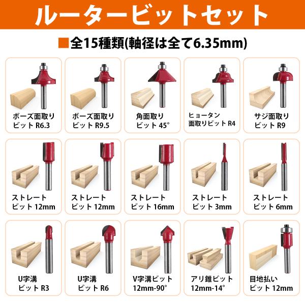 木工 電動トリマー ルータービット 15本セット 100V 800W 面取り 溝切り 加工 工具 ツール トリマービット 軸シャンク 6.35mm