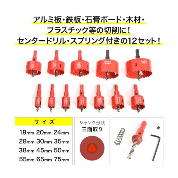 バイメタル ホールソー 12本セット ホルソー 穴あけ 切削 工具 18mm 20mm 24mm 28mm 30mm 35mm 38mm 45mm 50mm 55mm 65mm 75mm