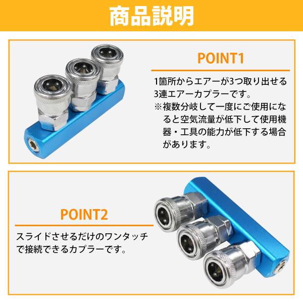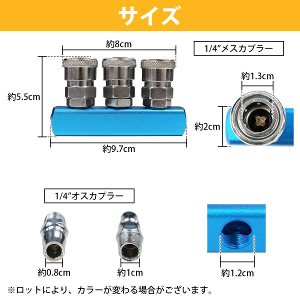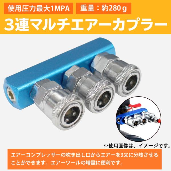 1/4 ワンタッチ式 3連 マルチ エアー カプラー 青/ブルー エア ホース ツール コンプレッサー 分岐 プラグ カプラー ホース