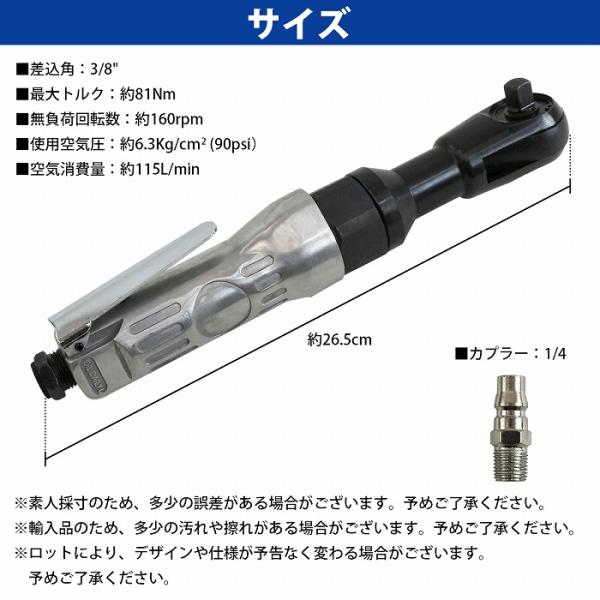 強力81Nm エアーラチェットレンチ 差込角 3/8 (9.5mm) 最大トルク 81Nm 強力 エアー ツール エア ラチェット レンチ 工具