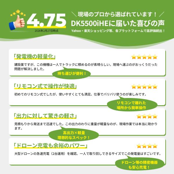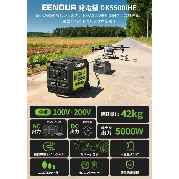 即納 EENOUR インバーター発電機 200V発電機 5000W 100V/200V兼用 42kg超軽量 最大5500W 一発始動 低騒音 セル付き リモコン付き 防災 イーノウ DK5500iHE