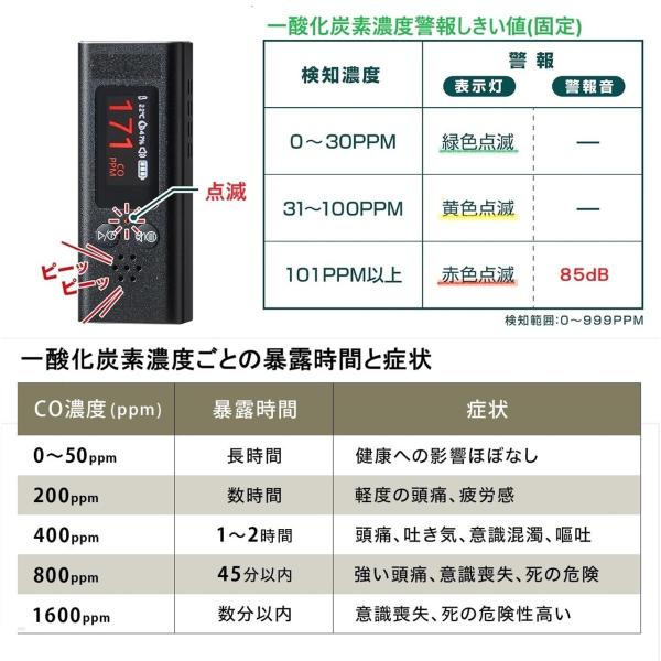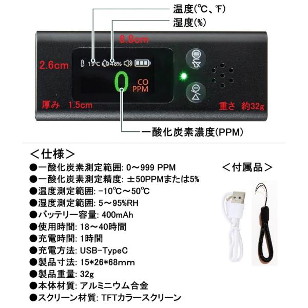 一酸化炭素測定器 高精度 瞬間検知 消音機能 携帯ポーチ付き Type-C充電 一酸化炭素チェッカー 一酸化炭素警報器 温度/湿度測定 日本語取扱説明書付き