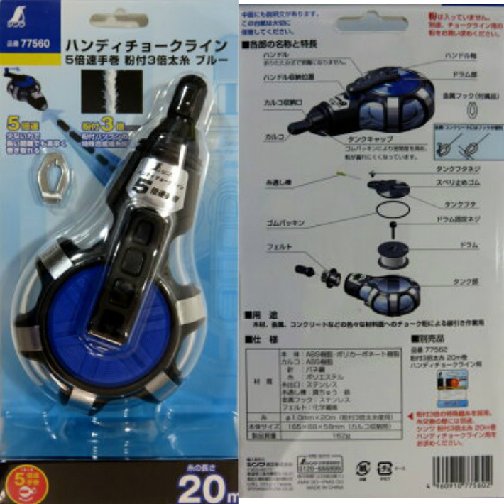 シンワ ハンディ チョークライン 5倍速手巻 粉付3倍太糸 ブルー 77560【墨つぼ】