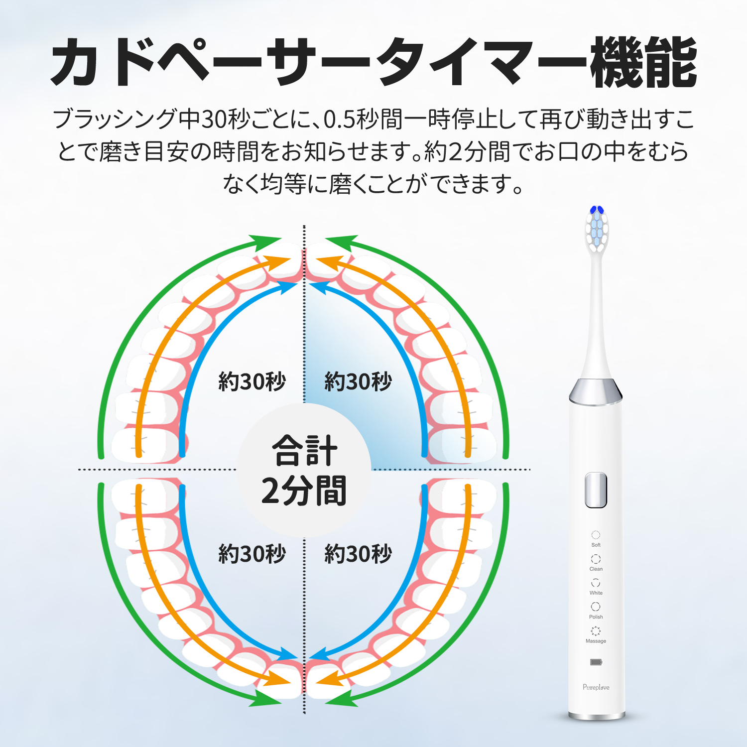 電動歯ブラシ 音波歯ブラシ IPX7防水 静音 38000回転/分 歯ブラシ 替えブラシ2本 ワイヤレス充電 5つモード タイマー