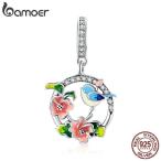 【実物写真あり】bamoer バモア シルバー925 ダングルチャーム ジルコン オキシダイズドシルバー エナメル加工 鳥 花 バーズ&フラワー
