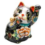 九谷焼 おいで猫(左手人お客招き猫)4号黒盛 花と蝶
