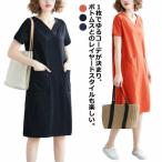 レディース tシャツワンピース 半袖 ロングtシャツ 柔らか 半袖 Vネック 夏 ワンピース 無地 きれいめ 大きめポケット 大きいサイズ 部屋着 シ