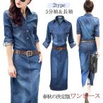 ロングデニムワンピース デニム シャツワンピース タイト デニム ワンピース 長袖 デニムワンピース マキシ丈 ロング丈 ロールアップ レディース 春