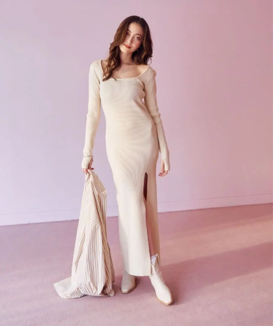 Blondey スクエアネックリブニットロングワンピース