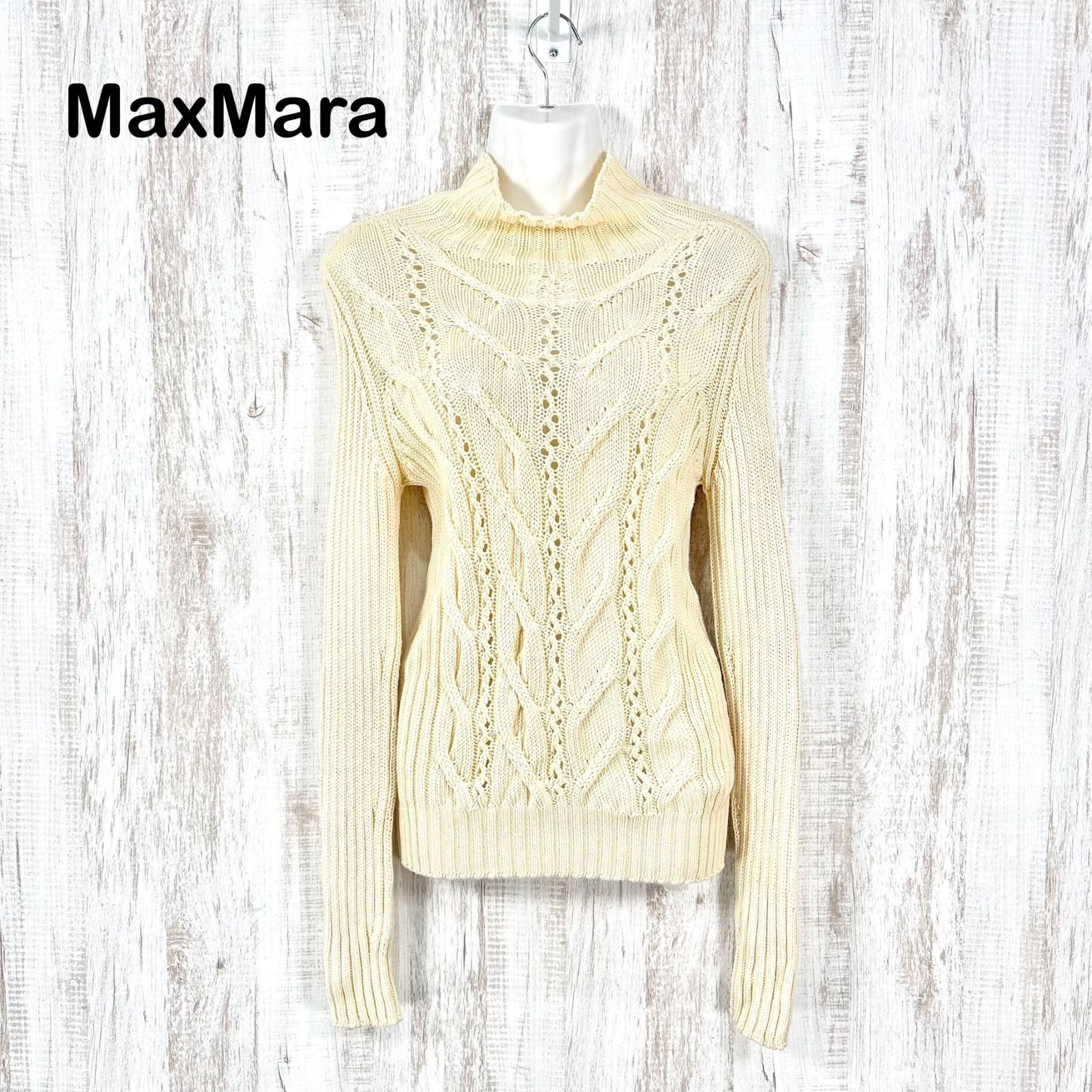 銀タグ MaxMara マックスマーラ ハイネック リブ ケーブル ミックスニット ウール ロングスリーブ セーター ホワイト レディース 長袖 トップス