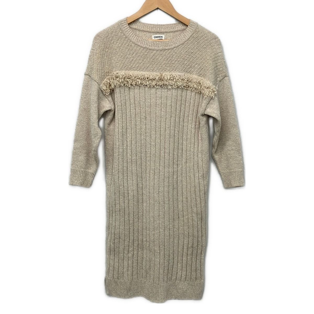 Coohem(コーヘン) ワンピース サイズ36 S レディース - ベージュ クルーネック/長袖/ロング/ストライプ/フリンジ