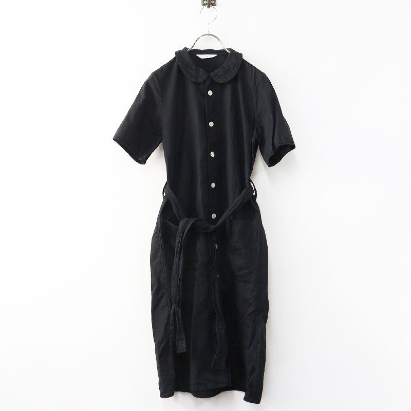 ホームスパン homspun リネンバイオ シャツワンピース S|ブラック トップス 半袖 ラウンドカラー 前開き【2400014915808】