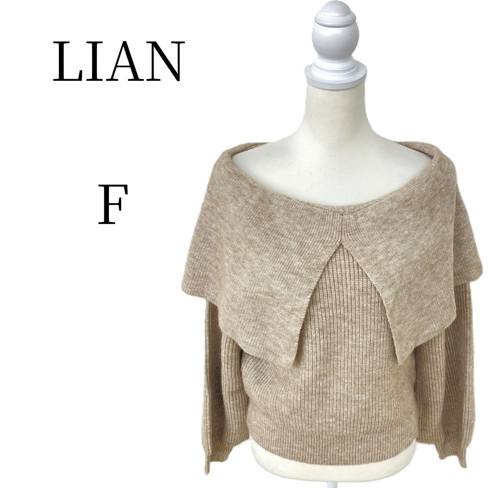 LIAN リアン ビッグカラー ニット セーター F ベージュ オフショル 襟付き リブニット ボリューム袖 洗える 大人可愛い きれいめ カジュアル オフィス 上品 春 秋 冬