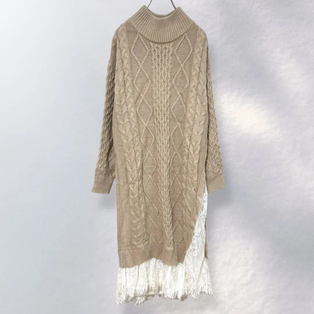 リルデシュシュ ニットワンピース ロング 裾レース ハイネック M《i498