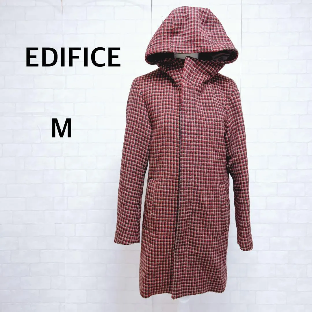エディフィス ロングコート 千鳥格子 チェック柄 ワインレッド カシミヤウール混