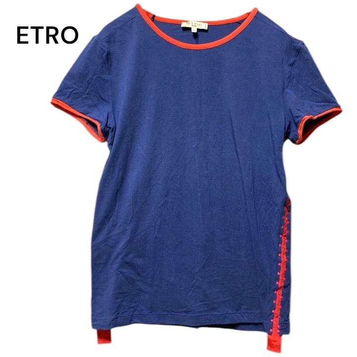 ●棚番号Y-4 ETRO エトロ イタリア製 Tシャツ サイドテープデザイン レディース ネイビー 赤パイピング カットソー サイズ46 トップス