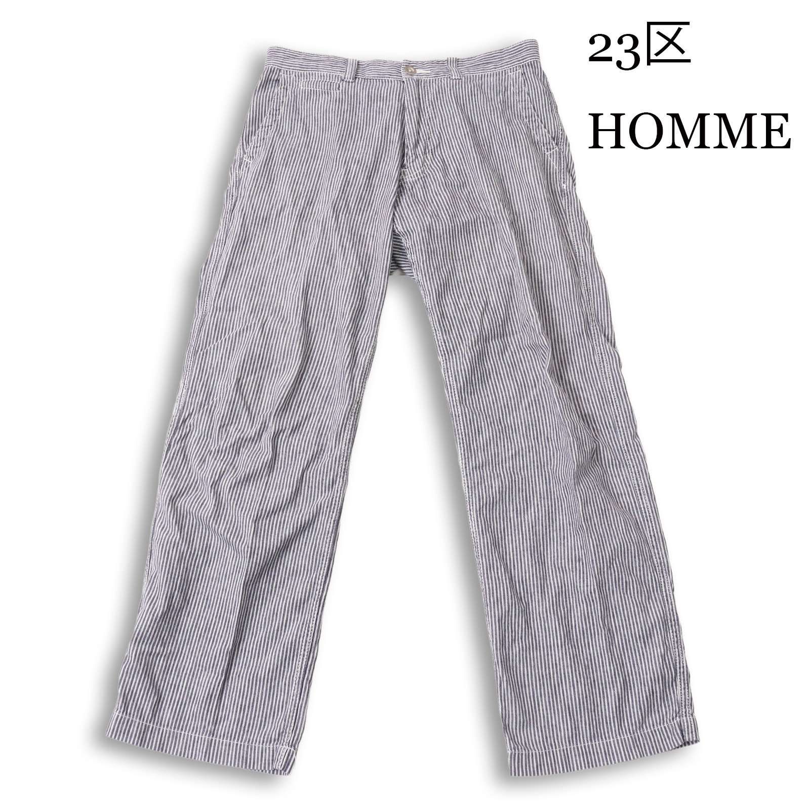 23区 HOMME オム 春夏★ リネン ヒッコリー シンチバック ワイド トラウザー パンツ Sz.46 レディース