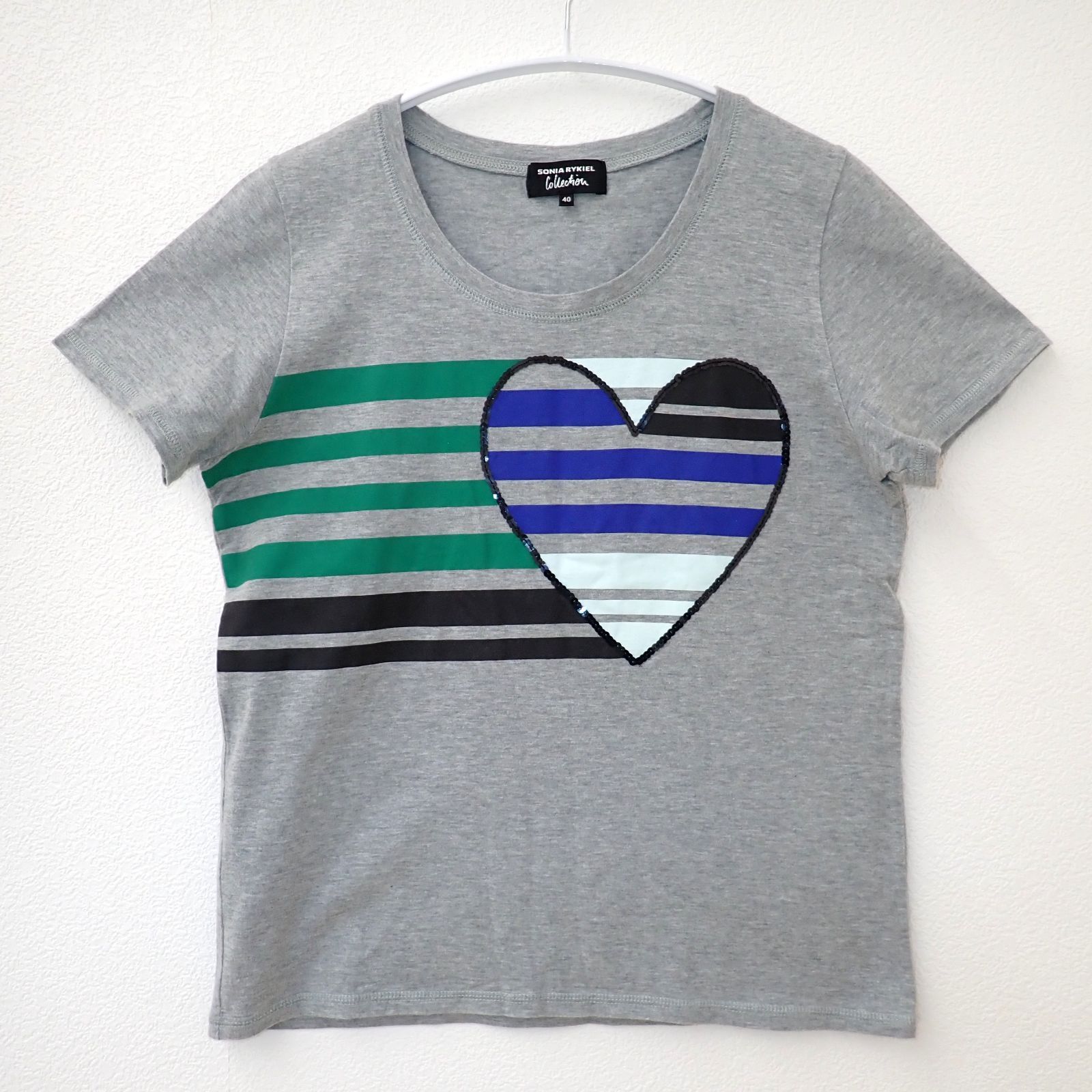 古着 レディースTシャツ ソニアリキエル オンワード樫山 SONIA RYKIEL サイズ40 M相当 グレー系 灰色 ハート スパンコール ボーダー カラフル