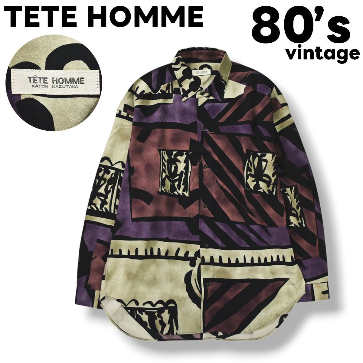 80s archive 初期 日本製 テットオム TETE HOMME 加藤和孝 KATOH KAZUTAKA 長袖 ポリエステル ドレープ シャツ ラウンドヘム F 総柄 マルチカラー メンズ