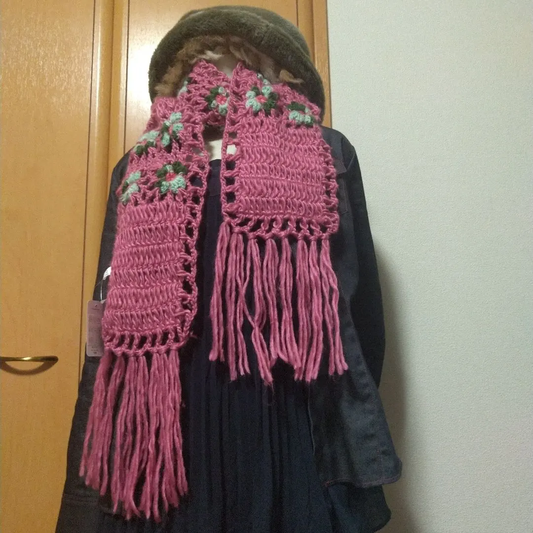 タグ付き新品未使用 花柄刺繍 モチーフ ピンク ニットマフラー フリンジ
