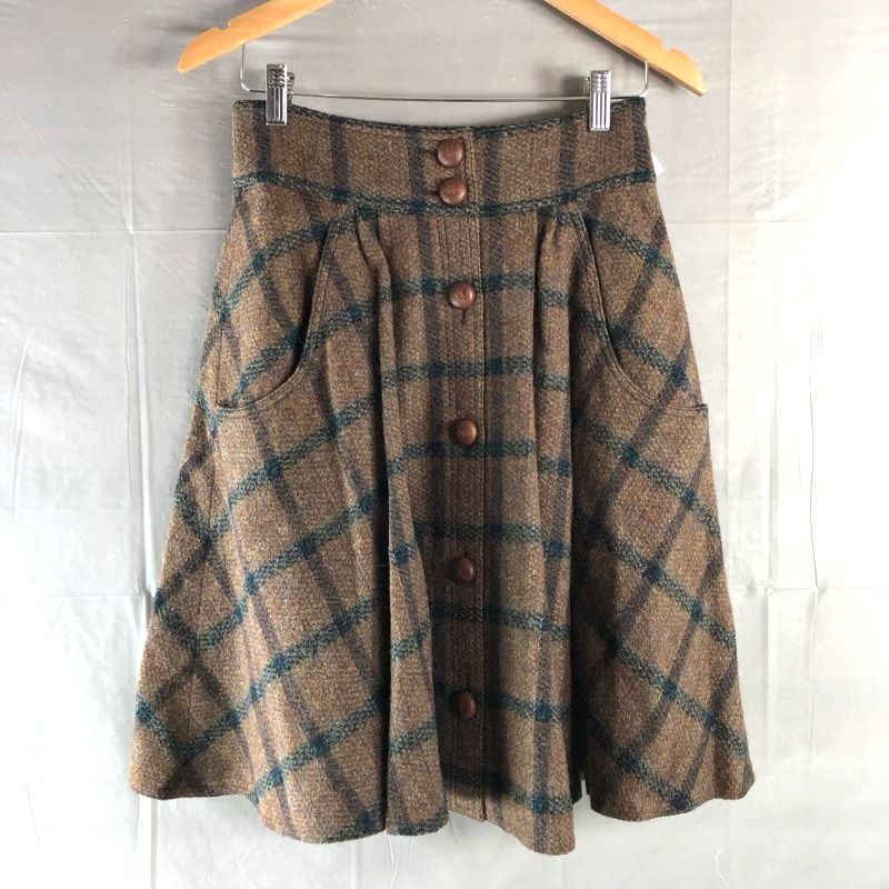 ショーン schon スカート チェック柄 膝丈 フレア ロゴボタン ブラウン系 44サイズ 978960