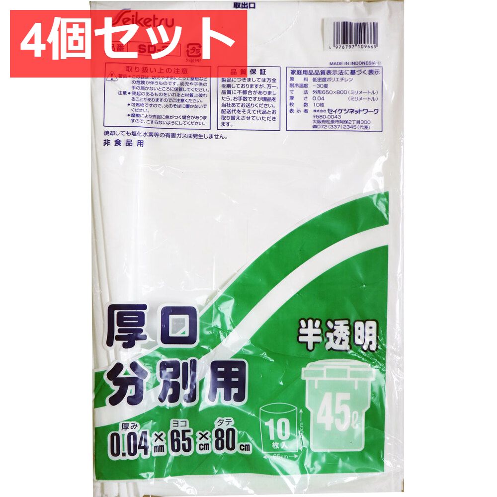 4個セット 分別用ごみ袋 半透明 45L 厚口 0.04×650×800mm 10枚入