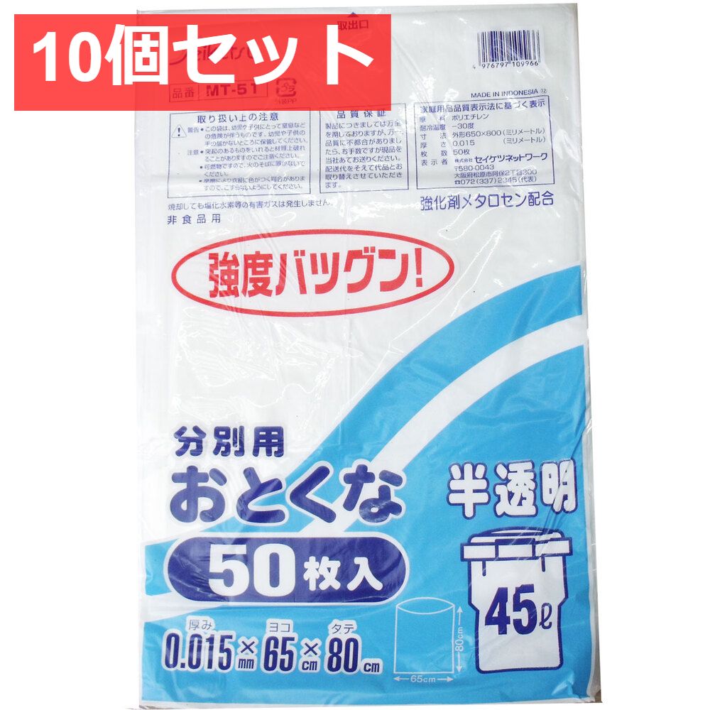 分別用ごみ袋 半透明 45L 0.015×650×800mm 50枚入 10個セット まとめ売り