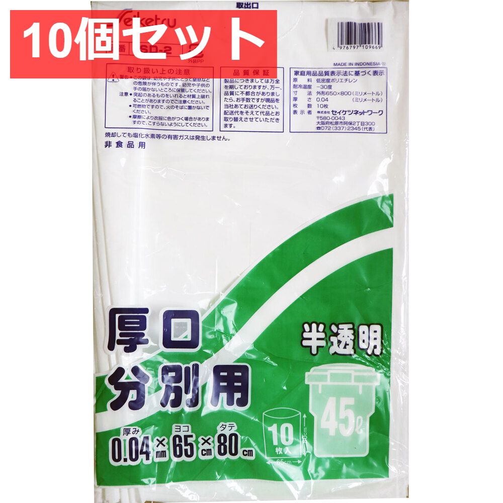 10個セット 分別用ごみ袋 半透明 45L 厚口 0.04×650×800mm 10枚入