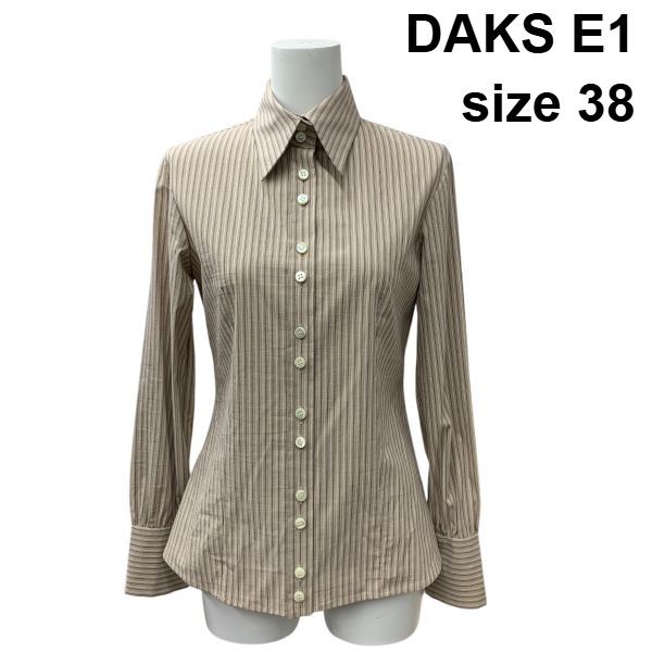 ◇ ダックスイーワン DAKS E1 シャツ レギュラーカラー 長袖 ストライプ ウエストシェイプ ベージュ 綿混 38 M 9号 レディース Z6B825