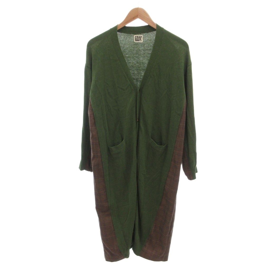 フラボア FRAPBOIS ロングカーディガン コットンニット ウール混 1 黄緑 Vネック チェック柄切り替え/HW ■GY58