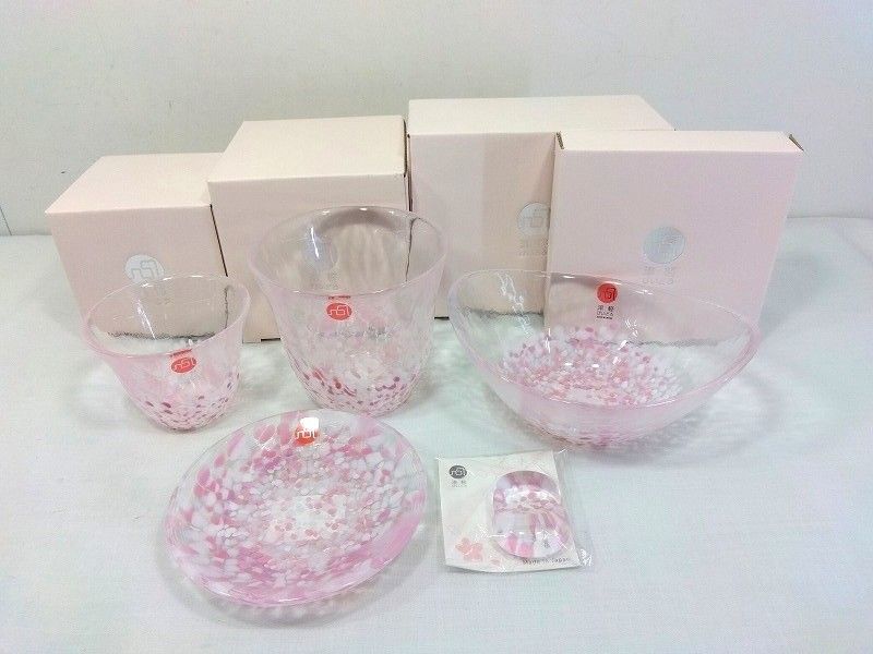 26g-369k【中古】津軽びいどろ SAKURA さくら フリーカップ 楕円小鉢 豆皿 盃 小判箸置 5点セット
