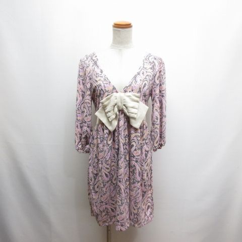 リッチ rich ペイズリー柄 リボン ワンピース S ピンク 七分袖 深Vネック 日本製 タグ付き