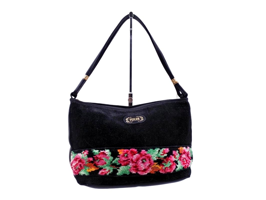新品 FEILER フェイラー パイル素材 花柄 セミショルダー バッグ 黒 ■■ レディース
