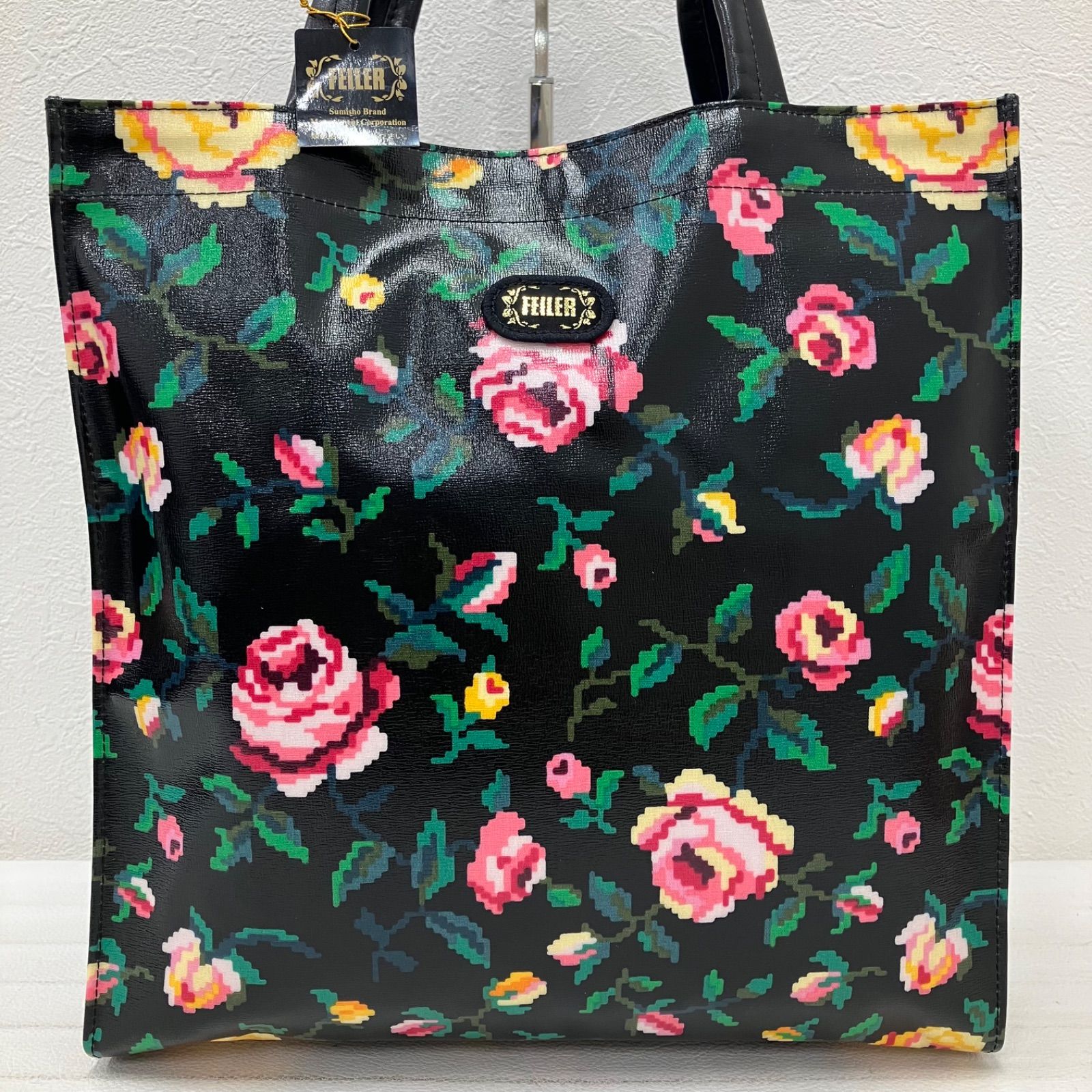 5638 FEILER フェイラー トートバッグ ハンドバッグ 花柄 フラワー バラ 黒 ブラック PVC 軽量 タグ付き