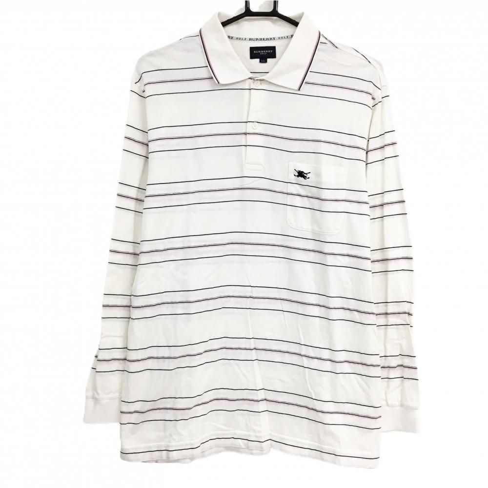 バーバリー 長袖ポロシャツ 白×黒×ピンク ボーダ 胸ポケット メンズ LL ゴルフウェア BURBERRY GOLF