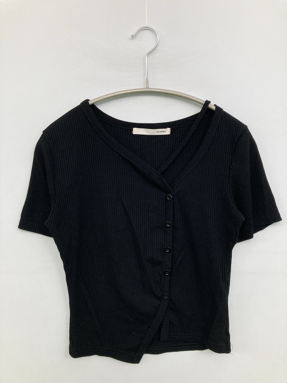 by muni:r バイムニール Tシャツ/カットソー F ブラック 無地 ショート丈 半袖 Vネック