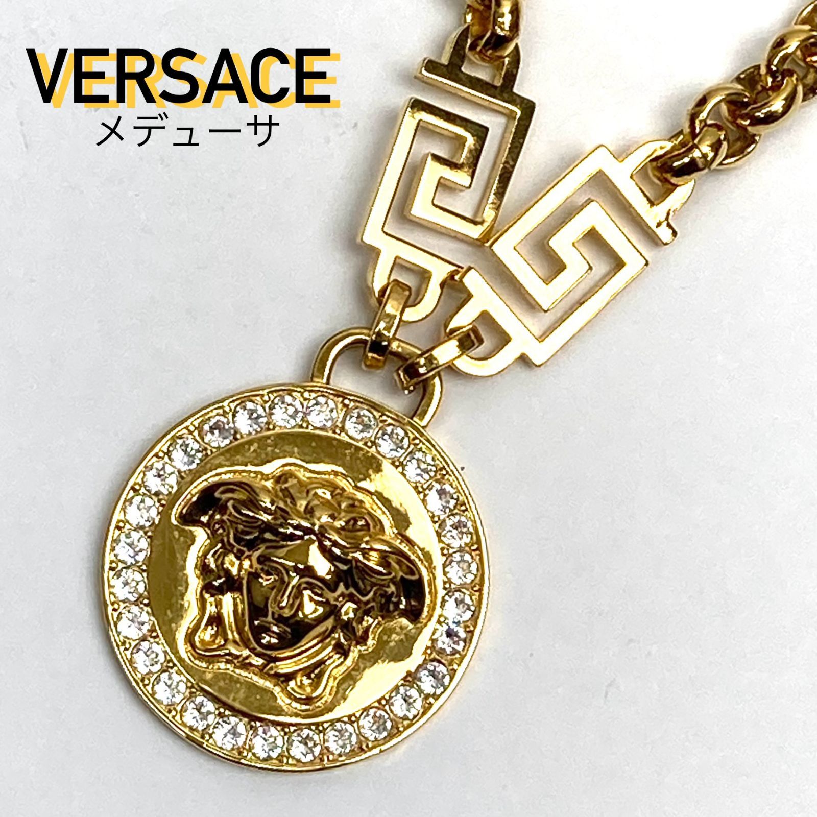 t) VERSACE ヴェルサーチ メデューサ グレカ ネックレス GP ラインストーン ゴールド 箱・ケース・紙袋付属 ※ 中古