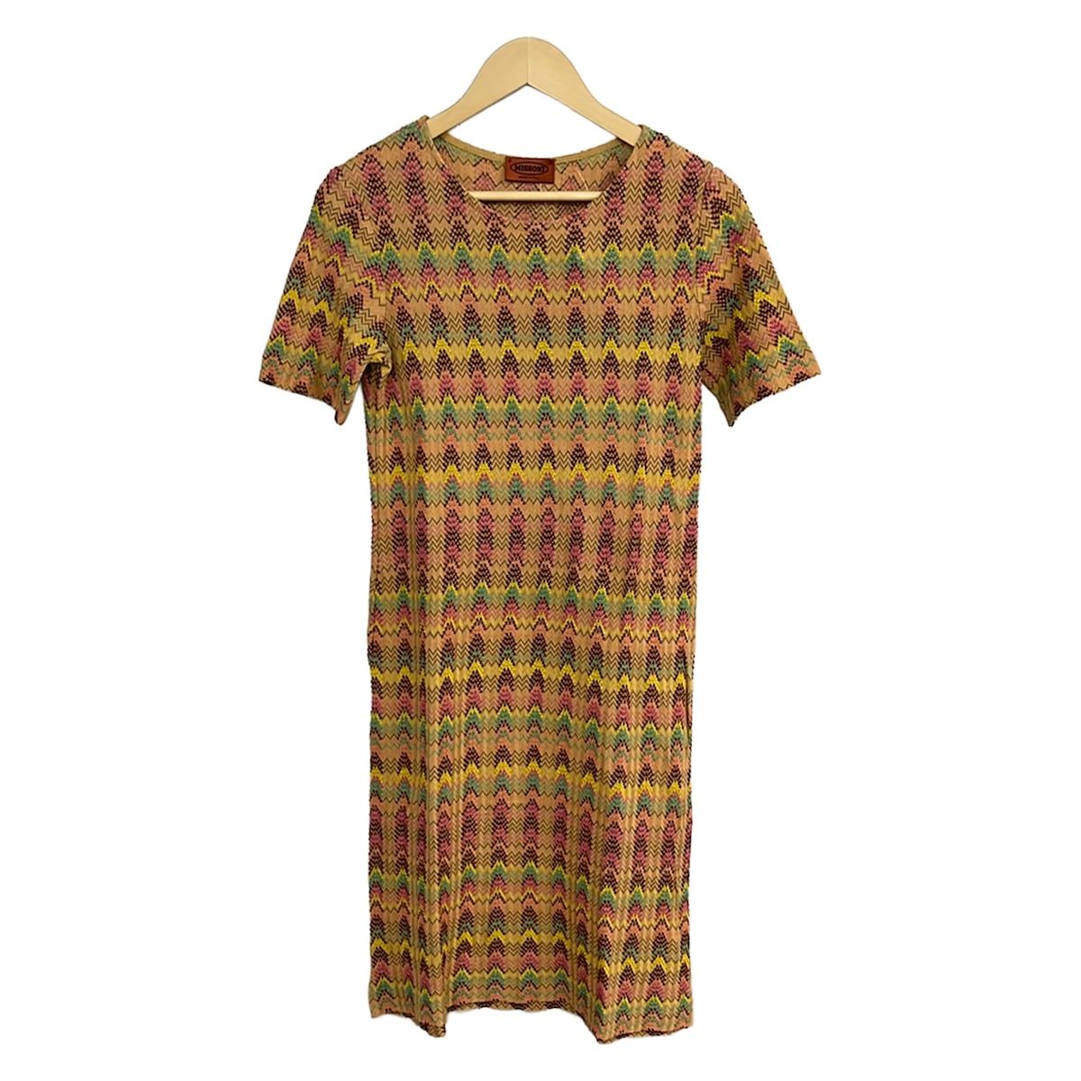 MISSONI(ミッソーニ) ワンピース サイズ11 M レディース美品 - ベージュ×イエロー×ピンク 半袖/ニットワンピース