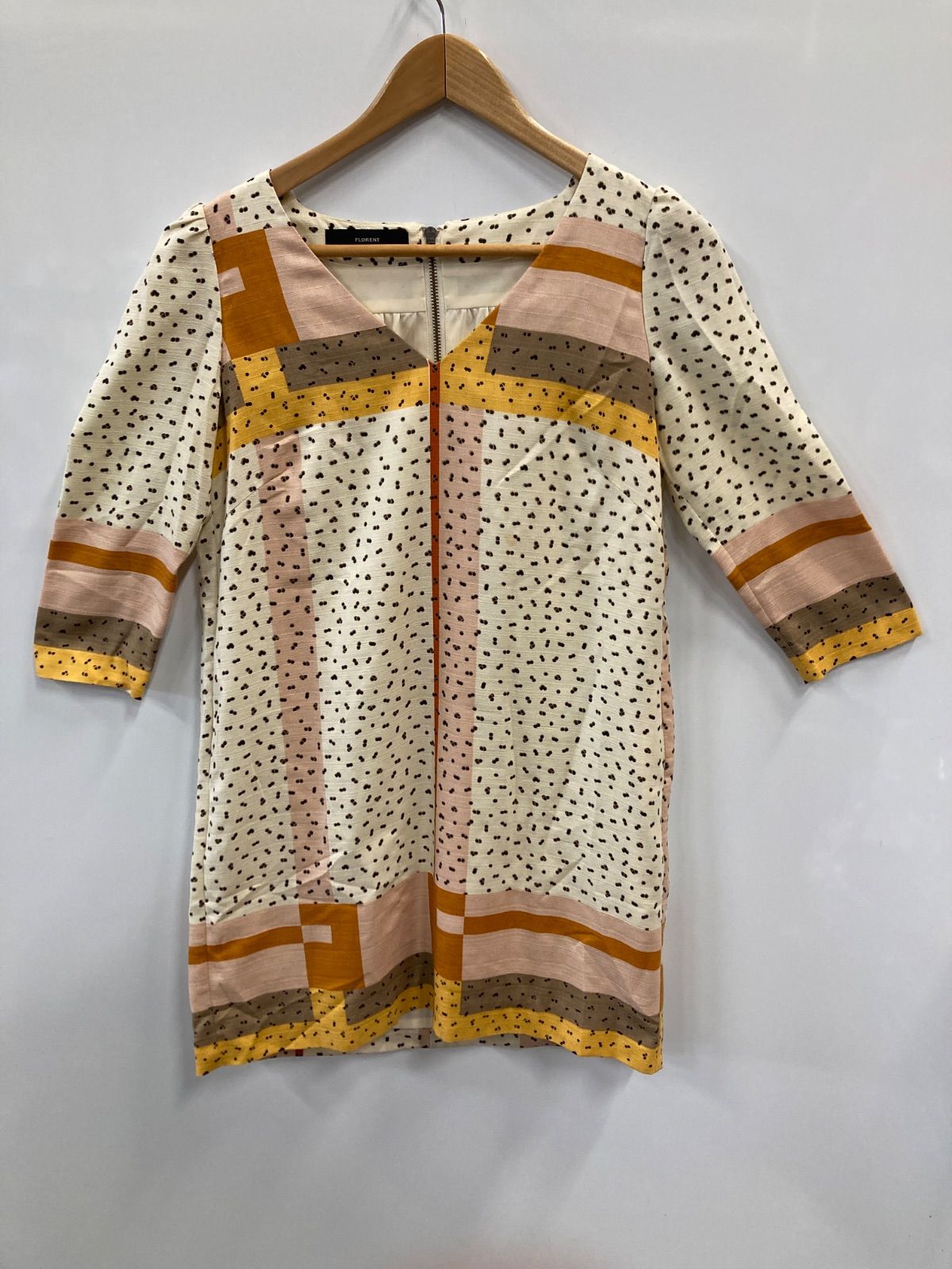 ピ765⚫︎FLORENT⚫︎フロレント⚫︎チュニック⚫︎5分袖⚫︎Vネック⚫︎ひざ丈⚫︎ボーダー⚫︎ドット柄⚫︎レディース⚫︎size表記なし⚫︎白×ベージュ×オレンジ×茶×黄⚫︎日本製
