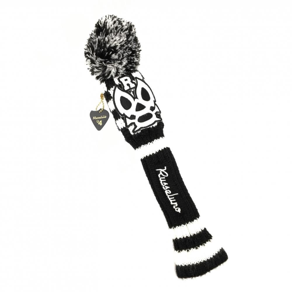 【美品】ラッセルノ ニットヘッドカバー(UT) 黒×白 上部ブロックチェック ルチャマスク ユーティリティ ボンボン付 ゴルフ RUSSELUNO